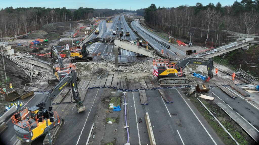 In early 2024 GJ Mats played a critical role in the M25 Junction 10 improvement scheme, supplying our sturdy hardwood Ekki bog mats to provide a solid foundation for the demolition and construction work. The operation involved the closure of the A3 south of the M25 to facilitate a crucial operation – the demolition of the reinforced concrete Wisley footbridge and the post-tensioned Cockcrow footbridge.
